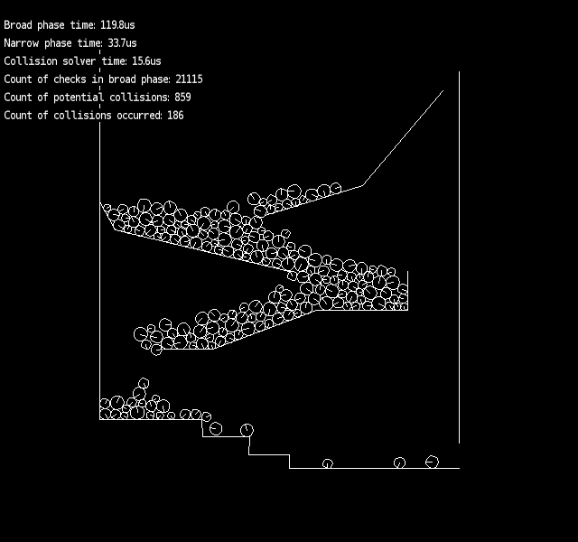 An example application was written, to demonstrate the ideas were described above. The source code of the example you can find at GitHub: BroadPhase. The demonstration application is written in C++ and uses CImg library to visualize the process. This application is a simplified physics engine that demonstrates the basic concepts, particularly a part that runs the broad phase. There are two implementations of broad phase: