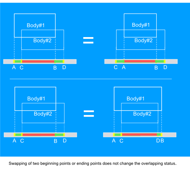 Suppose we have a set of intervals that may overlap and that represent an AABBs in one dimension. Each interval formed by two points that are referred to as endpoints. We have already talked about the condition when two intervals overlap, for 1D problem it is as simple as: