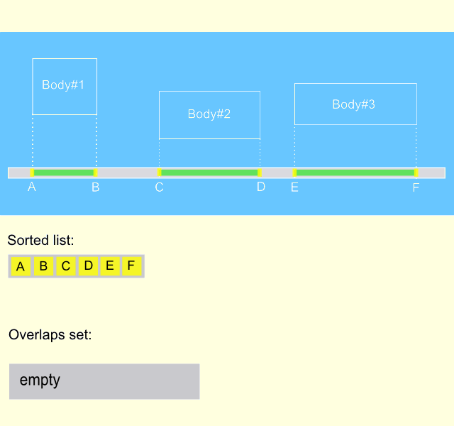 As we can see, nor sort phase neither sweep phase do not generate hole data from scratch every frame, both phases are only updating existing data. This means that sort and sweep algorithm represents an incremental approach, that makes it extremely fast. The gif animation below describes the process on the time interval of several frames. It can be seen, that body#1 moves from the left position to the right one, meanwhile entering and exiting the intersection with the other two bodies. It is remarkable, that the overlapping list is updated only when the states of intersections are changed.