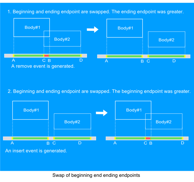 Let us turn now to the second phase - sweep. As was mentioned above, it's complexity is , but there is still a possibility to optimize it. Due to temporal coherence, the list of overlapping intervals won't differ much from frame to frame. There is no reason to generate the whole list of overlaps every frame, instead, we could track only swaps in the first phase and apply the modifications to the list of overlaps. Let's look at the interaction between these two phases in terms of producer-consumer model. In other words, the sorting phase produces events and the sweep phases consumes them, applying modifications to the overlaps list. What type of events can be produced? Depending on the type of endpoint were swept, three actions are possible: